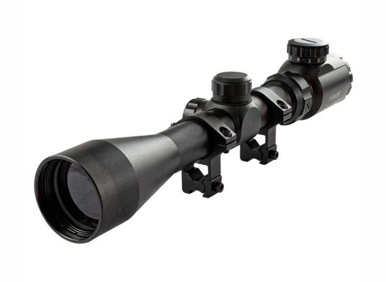 Luneta com retículo iluminado verde e vermelho com 5 níveis de intensidade do brilho.