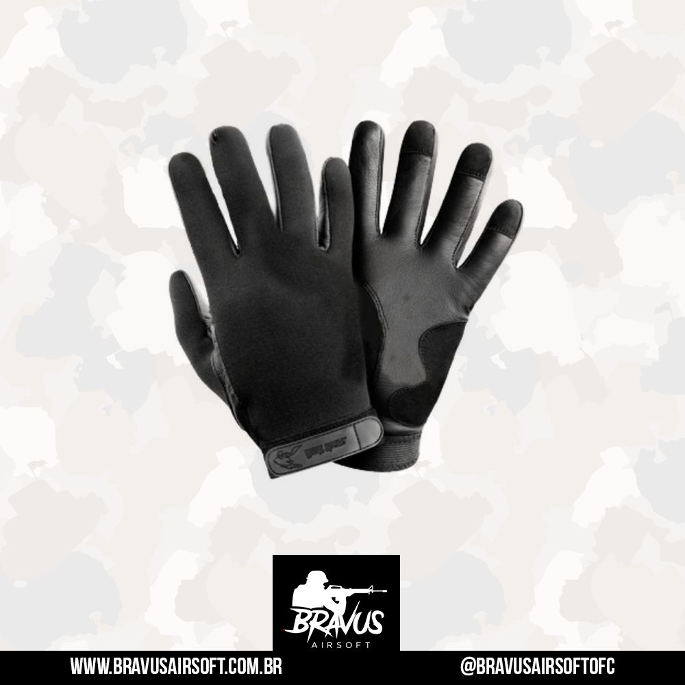 Luva tática de atirador confeccionada em Couro (versões em couro bovino ou cabra) e Neoprene® de alta sensibilidade tátil para uso militar em operações de táticas. Uso de armas de fogo, e manejo de equipamentos. Esse modelo se conforma com a mão do usuário.