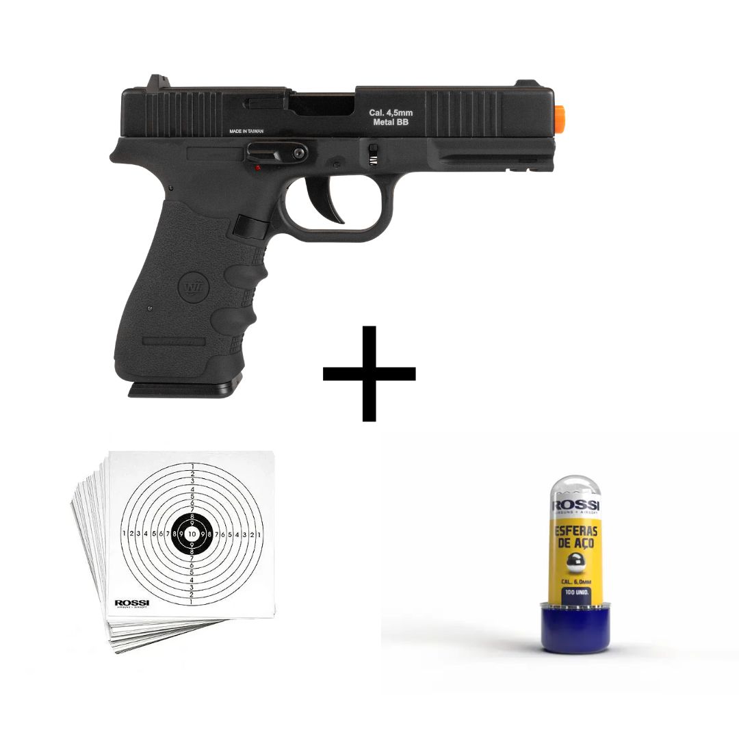 1. Wingun W119 CO2 4,5mm: A estrela do kit, a pistola de ar comprimido Wingun W119 é alimentada por cápsulas de CO2, proporcionando uma experiência de tiro precisa e potente. Com design ergonômico, miras ajustáveis e construção durável, esta pistola é ideal para treinamento, prática de tiro ou diversão casual.